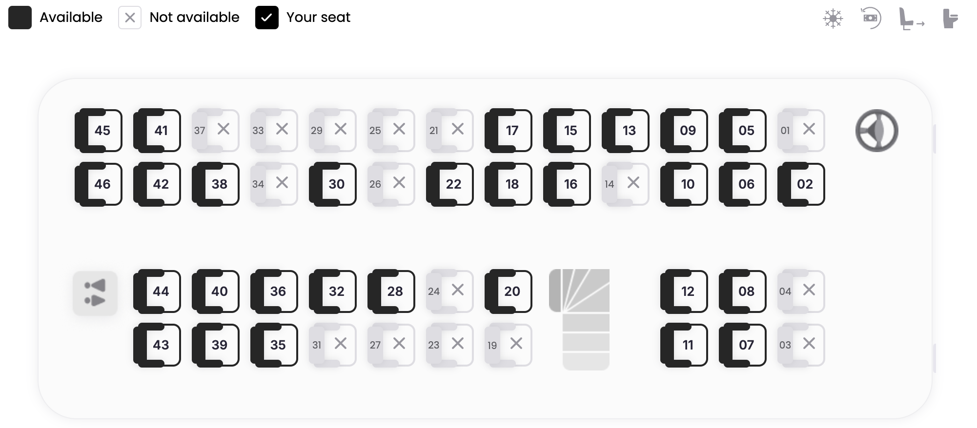 - Include the aisle area in your seat map: We recommend to read the information in detail from our seat maps to include the aisle in your graphical representation of the seat map. This will help users understand better how to choose their seat.